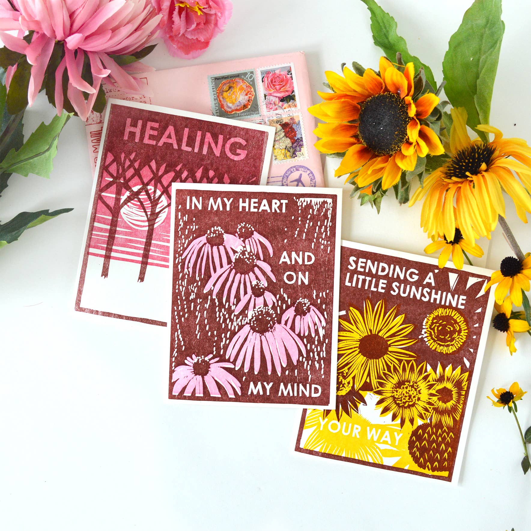 Letterpress, 100% post-consumer recycled paper, A2, blank inside, cello sleeve with envelope.