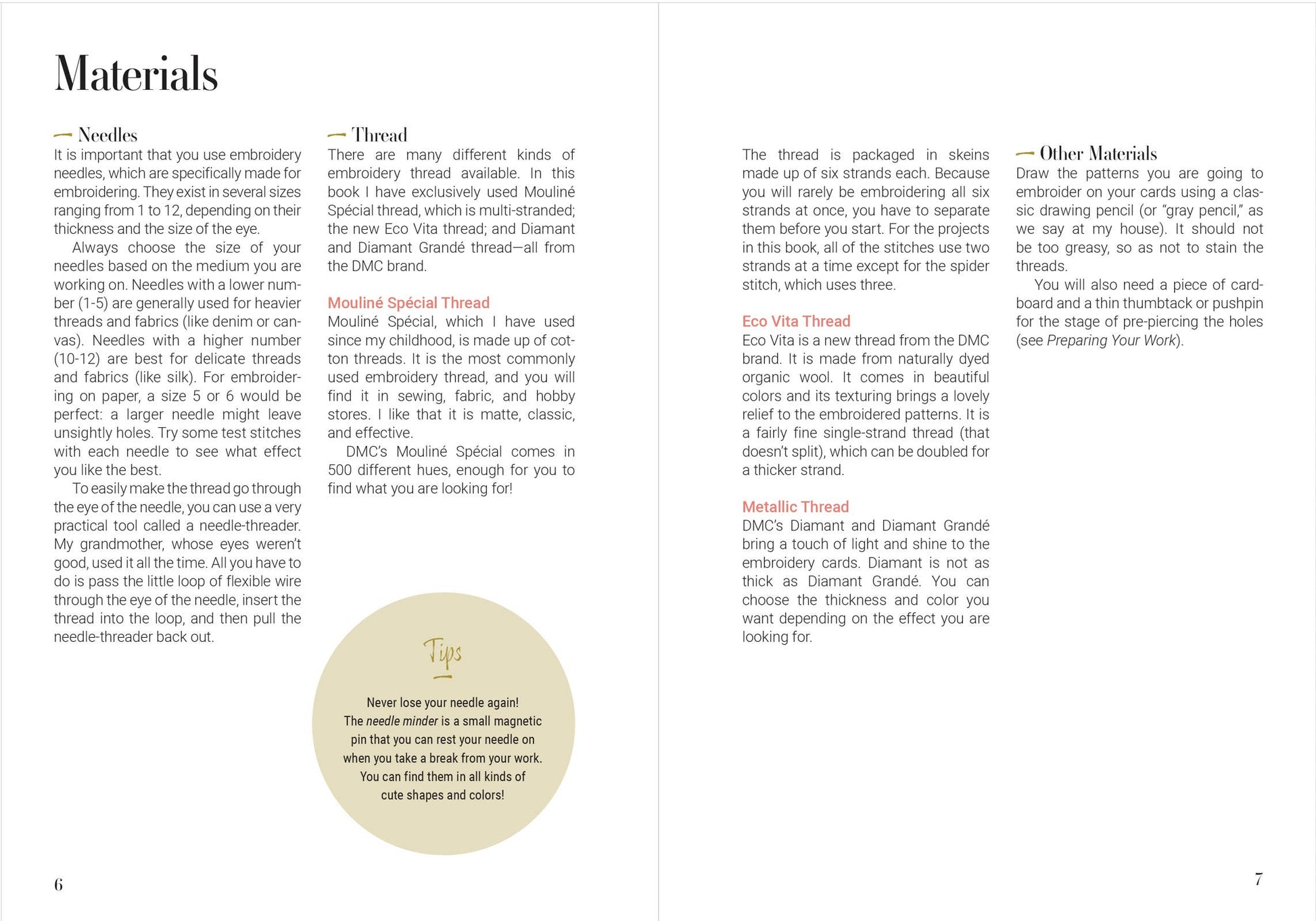 Embroidery Notecards contains 24 ready-to-embroider notecards: 12 unique designs with 2 cards each. The included booklet gives step-by-step instructions, explains necessary embroidery techniques, and provides a list of needed materials.