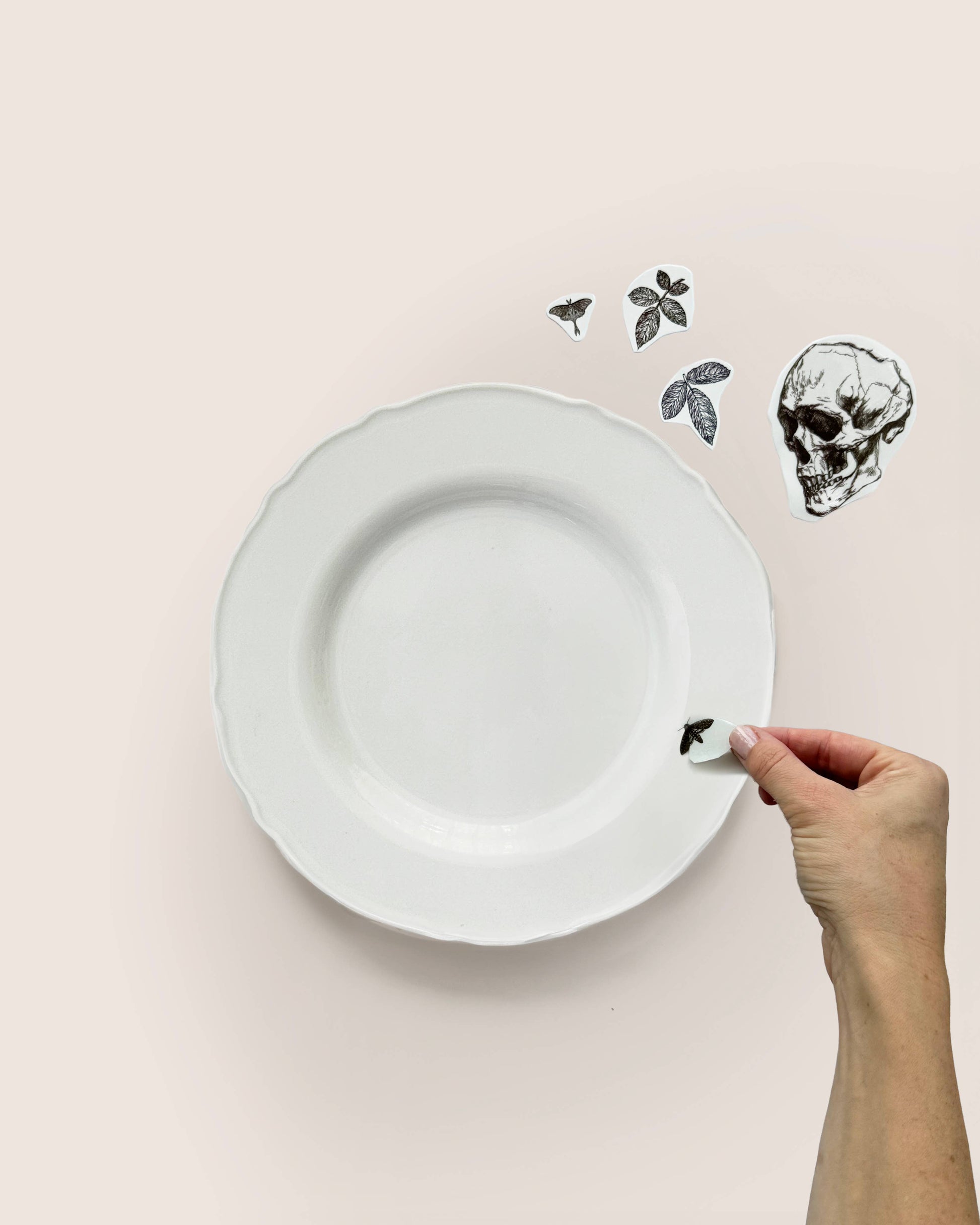 Add a touch of drama to your home with our inked tattoo-inspired gothic skulls and botanicals tattoos. Perfect for creating a bold contrast on classic vintage tableware, and also any other neutral plain surface.