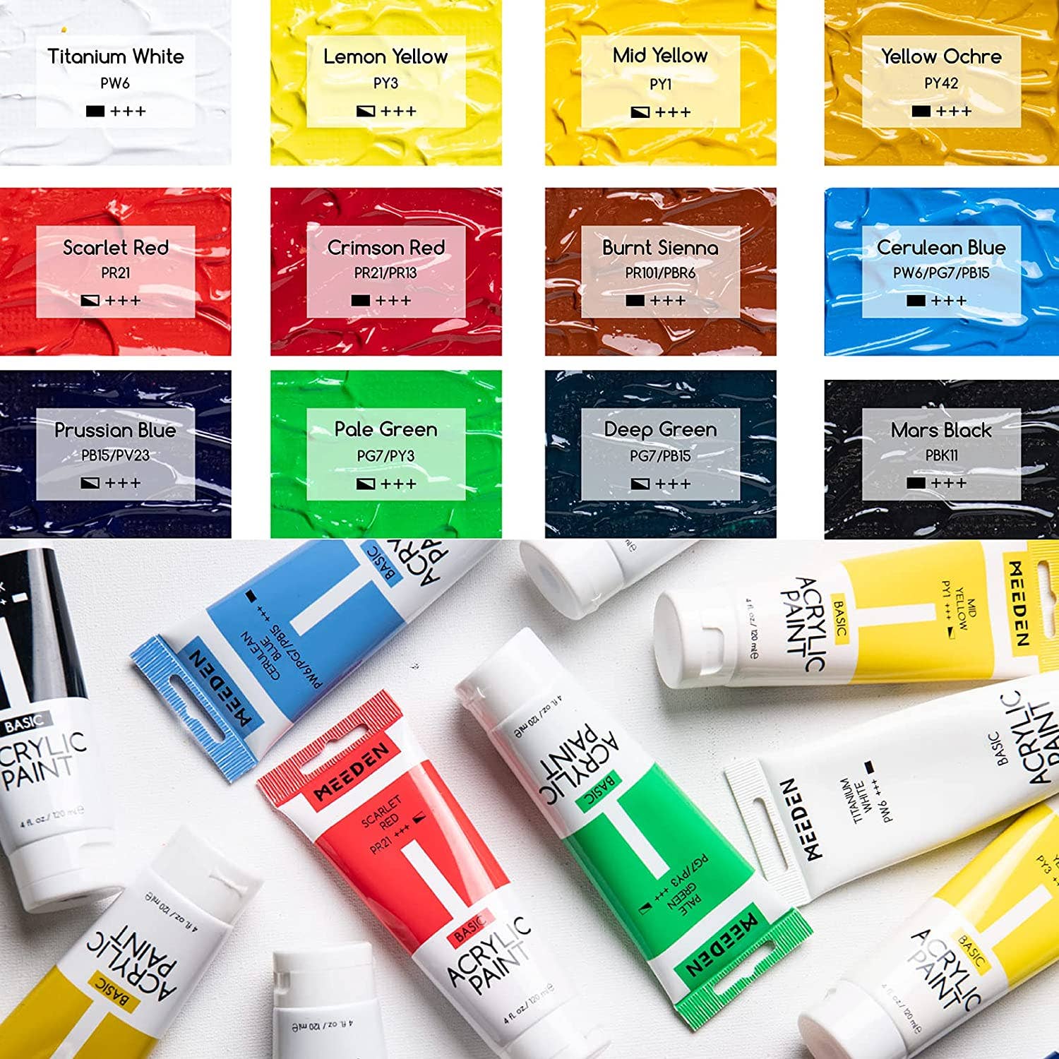 * FUNDAMENTAL CHOICE: The set has the strong price-performance-ratio for the same quality, and the best quality at the same price range. MEEDEN provides 12 (120ml/tube) colors in a well-designed package.