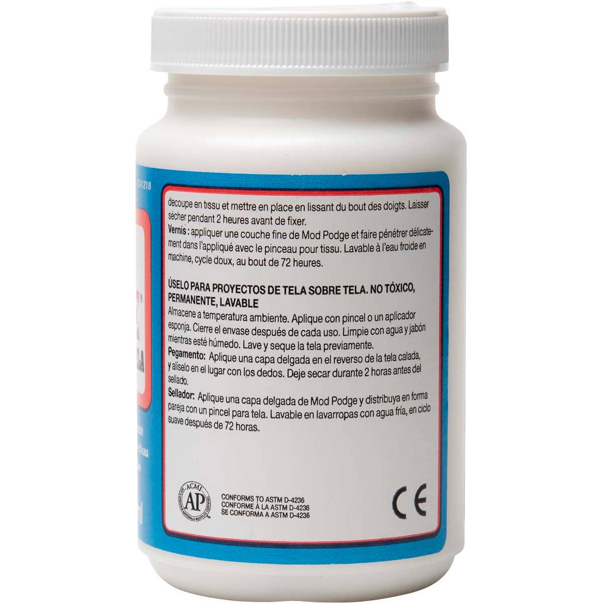 For over 50 years Mod Podge has been America's favorite glue, sealer, and finish. Mod Podge Fabric dries clear, leaving a smooth, glossy finish. Use Mod Podge Fabric to apply paper prints or fabric swatches to clothes, totes, banners, and more! Preserve the beauty of all your decoupage projects and more with this multi-purpose, all-in-one sealant, glue, and finish. When applied to your fabric surface, this handy decoupage glue is permanent and is machine washable in cold water. Use this decoupage glue to add scraps of fabric to your favorite shirts, blankets, pillows, and so much more. Let your fashion creativity come alive with the limitless possibilities of Mod Podge Fabric.
