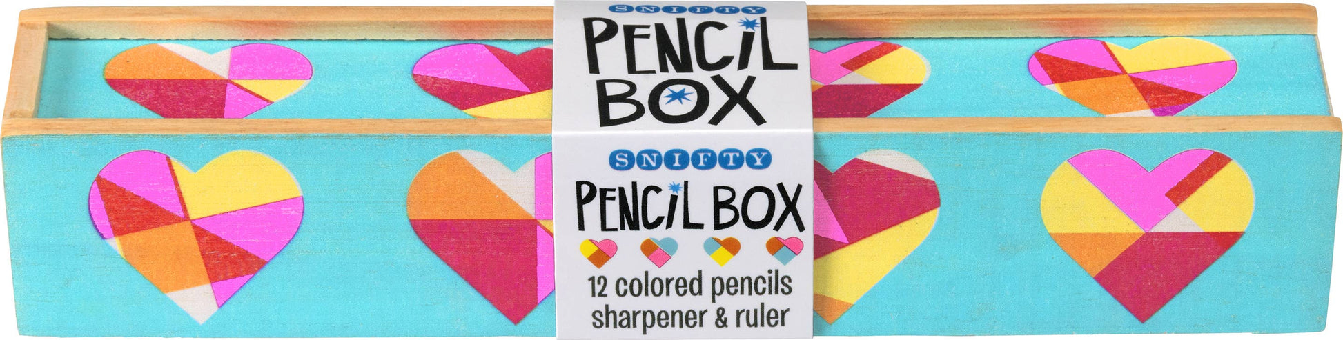 Vintage inspired, graphic wooden pencil box filled with 12 bright colored pencils with a slide top that doubles as a ruler + wooden pencil sharpener.