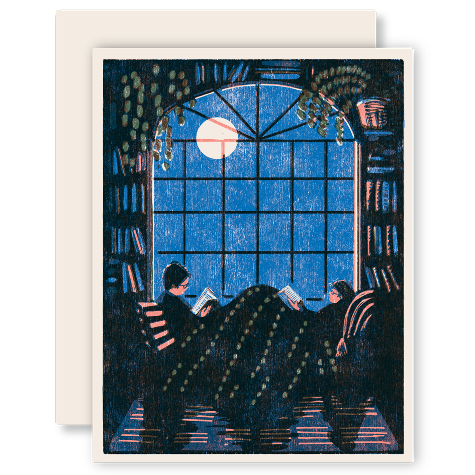 Letterpress, 100% post-consumer recycled paper, A2, blank inside, cello sleeve with envelope.