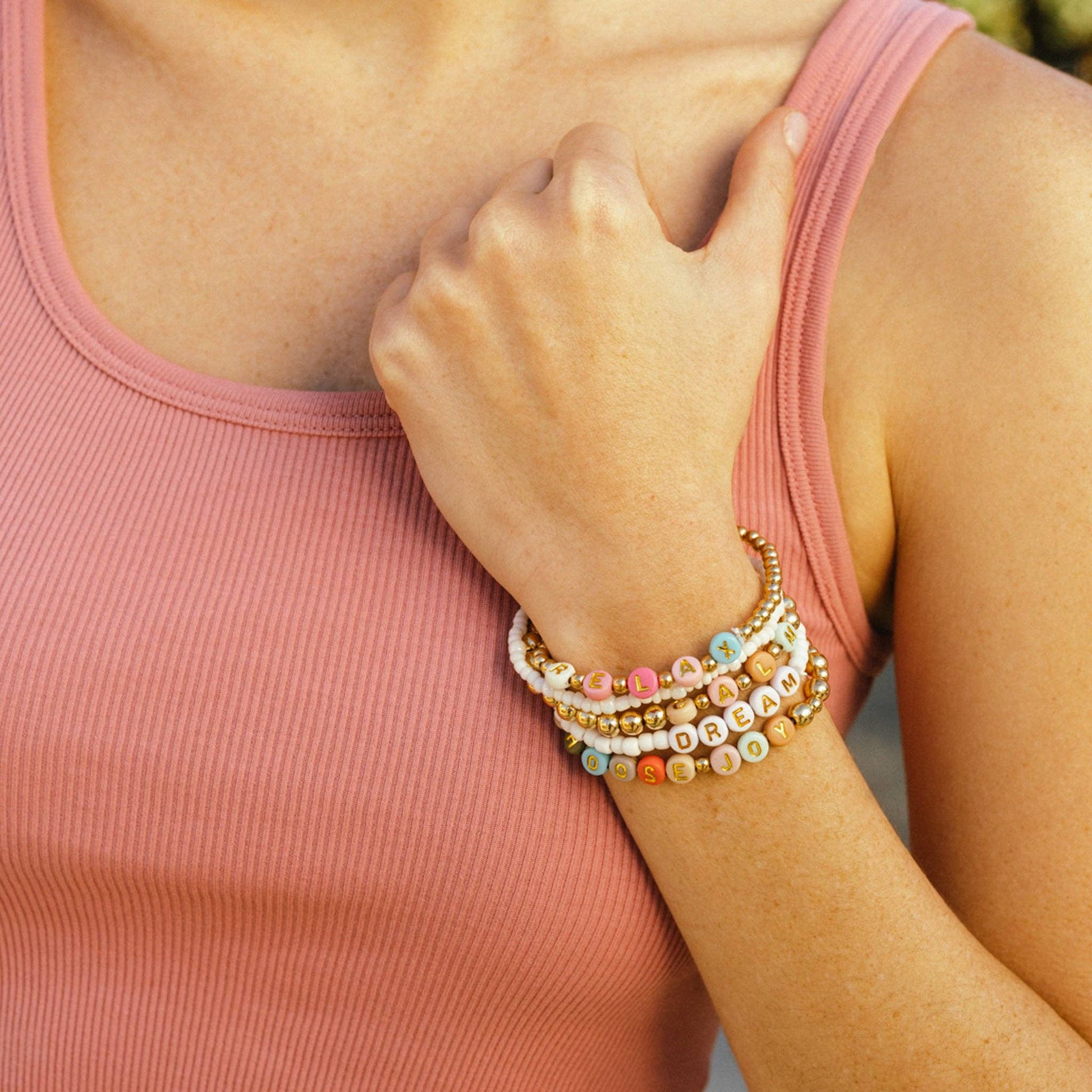 Let the chill vibes flow, RELAX, it's easy to create your own stretch word bracelet. Bead jar includes Multicolor pink, hot pink, turquoise, yellow, orange, and white with metallic gold letter alphabet beads and small gold round spacer beads. Make and trade friendship bracelets with the Original Bead Jar™. The Relax stretch bracelet DIY bead kit includes over 100 grams of beads and 5 yards of stretch cord in an eco-conscious reusable glass jar with a cork lid.