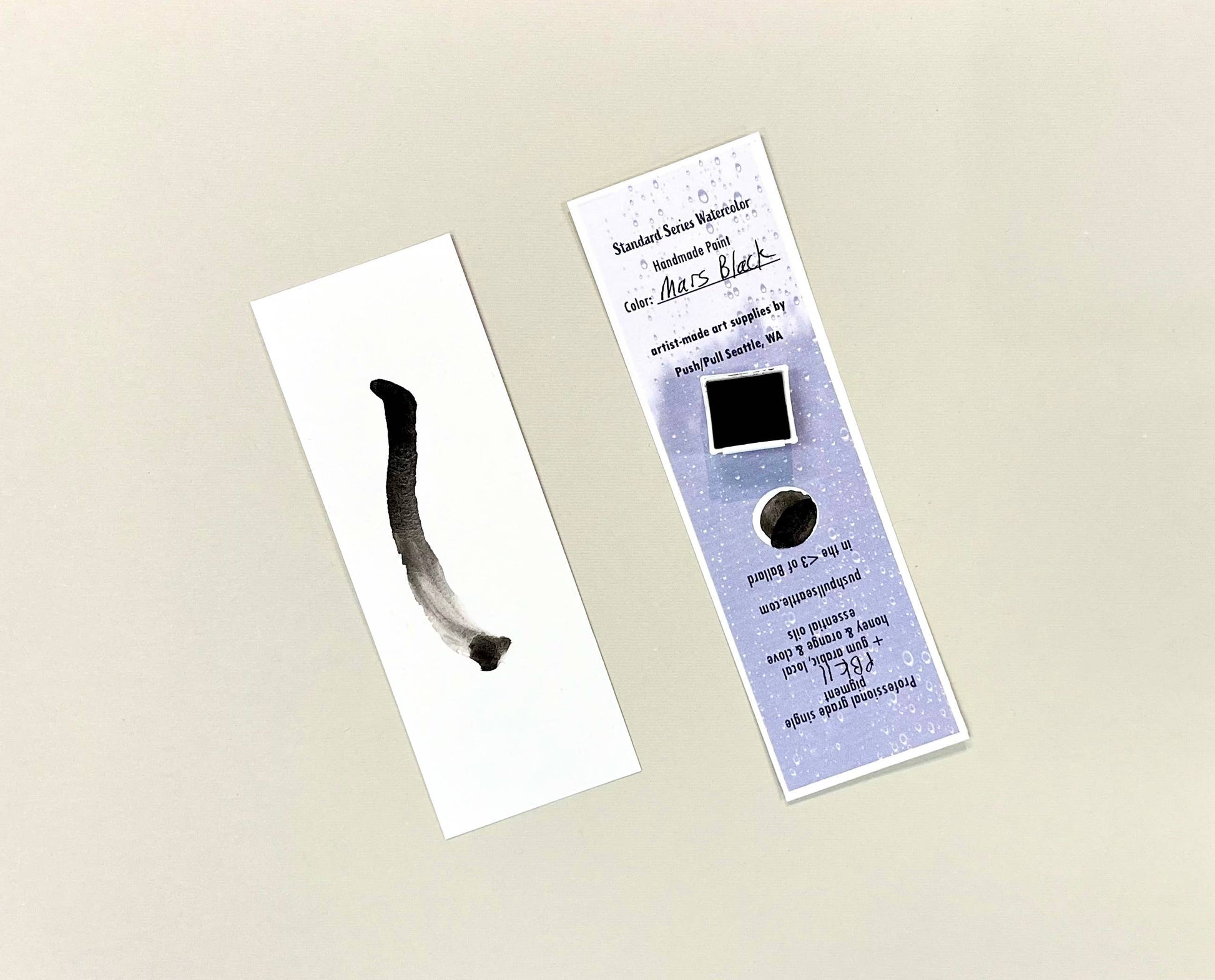 Watercolor in a standard half pan container, made by the artists of Push/Pull, with professional grade single pigment (PBk11) , & gum arabic, local honey, orange, clove, & essential oils. Half pan rests in any standard half pan holder.